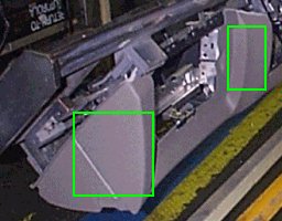WAY-2C's ability to use coloring to identify objects at a distance makes it suitable for automatic identification with minimal interference with ongoing processing. For example, as long as stable lighting is installed, a WAY-2C based system has no difficulty determining which of several different color instrument panels is passing this point. Either of the regions outlined, as well as others, would be suitable for this determination. The identification information can be passed to a bar code printer, c